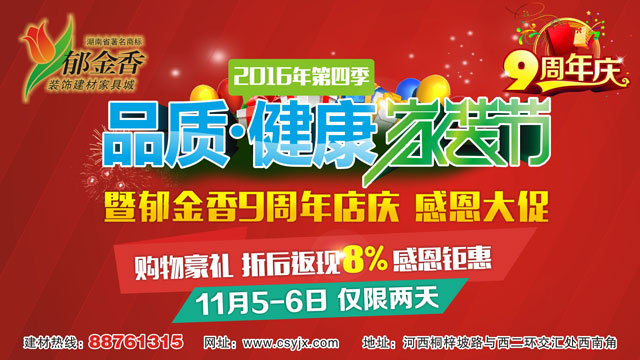 郁金香第四季品质健康家装节暨九周年店庆 11月5日—6日 郁金香9周年狂欢 工厂直销、补贴返现、购物大奖、精美礼品… 家居建材感恩大回馈!